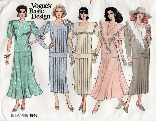 Vogue Basic Design 1846 Womens Straight Dropped Waist Dresses 1980s Vintage Sewing Pattern Size 8