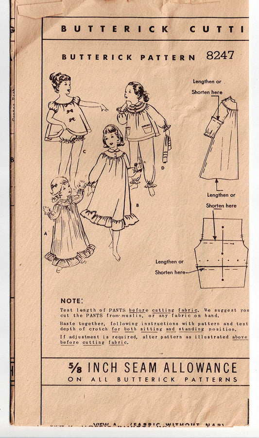 Butterick 8247 Toddler Girls Nightgowns & Pyjamas 1950s Vintage Sewing Pattern Size 2 Chest 21 inches