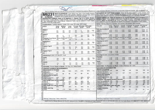 McCall's 6231 PLUS SIZE Mens Pyjamas Shorts & Robe Sleepwear Out Of Print Sewing Pattern Size XL - 3XL UNCUT Factory Folded