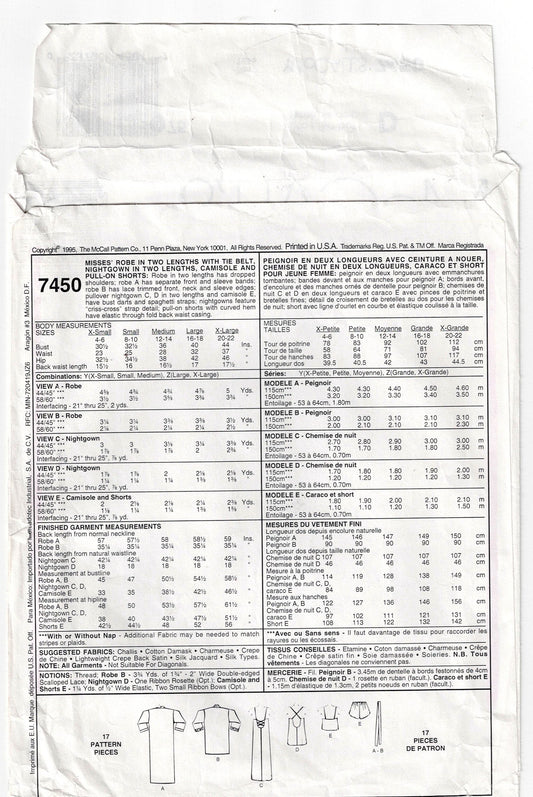 McCall's 7450 Womens Luxury Sleepwear Set 1990s Vintage Sewing Pattern Size XS - MED UNCUT Factory Folded