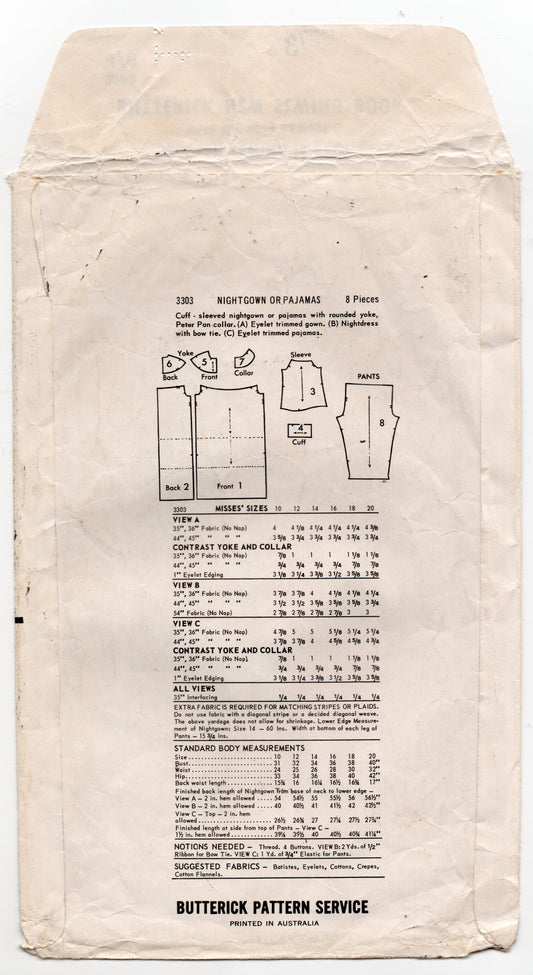 Butterick 3303 Womens Yoked Pyjamas & Nightgown 1960s Vintage Sewing Pattern Size 16 Bust 36 inches