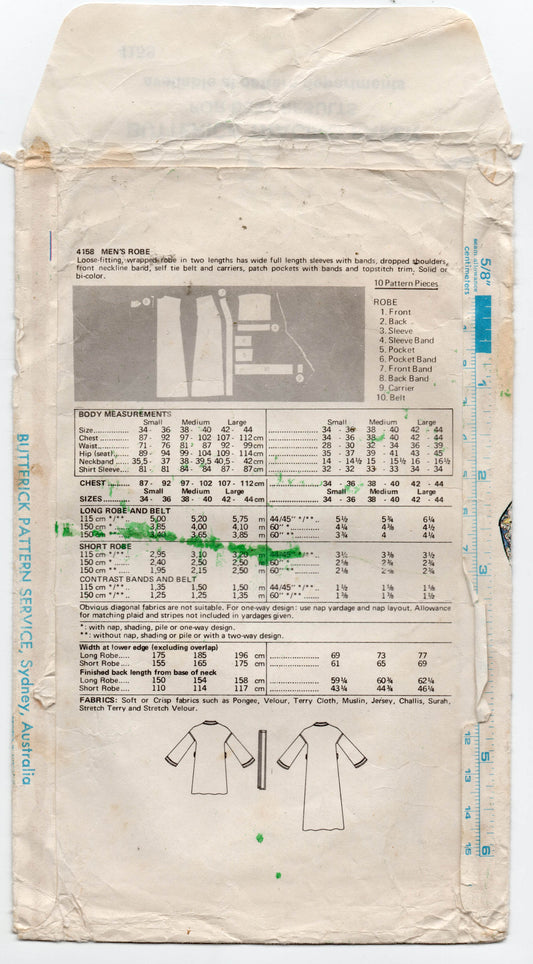 Butterick 4158 Mens Wrap Robe with Optional Contrast Trim 1970s Vintage Sewing Pattern Size MEDIUM Chest 38 - 40 inches