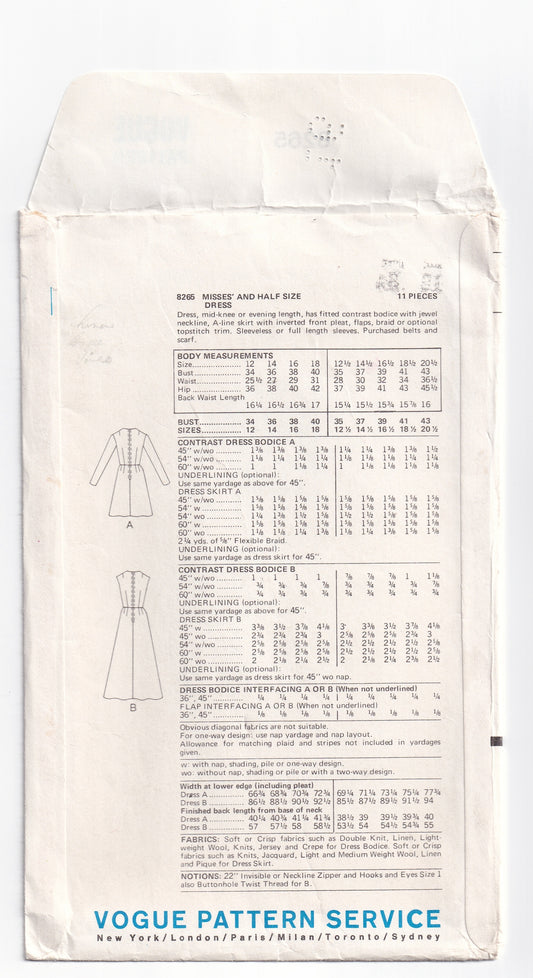 Vogue 8265 Womens Evening Dress With Princess Bodice & Inverted Pleat Skirt 1970s Vintage Paper Sewing Pattern Size 12 Bust 34 Inches UNCUT Factory Folded