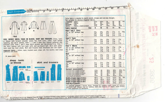 Style 3936 Womens Tucked Front Dress Tunic Skirt & Pants 1970s Vintage Sewing Pattern Size 14 Bust 36 Inches UNCUT Factory Folded
