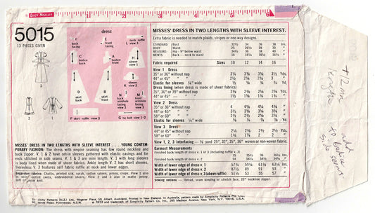 Simplicity 5015 Womens Empire Waisted Puff Sleeved Dress with Seam Interest 1970s Vintage Sewing Pattern Size 12 Bust 34 Inches