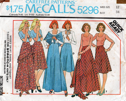 Patrón de costura vintage de los años 70 para faldas y chal con bies para camiseta de mujer McCall's 5296, talla 12, busto de 34 pulgadas