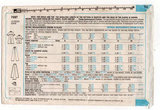 Patrón de costura vintage de los años 70 Simplicity 7297 para mujer, vestido, blusa, pantalones, bufanda y sombrero de pescador, talla 12, busto de 34 pulgadas, sin cortar, doblado de fábrica