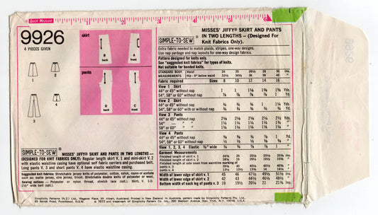 Patrón de costura vintage de los años 70 para faldas, pantalones cortos y pantalones JIFFY para mujer Simplicity 9926, talla 12, sin cortar, doblado de fábrica