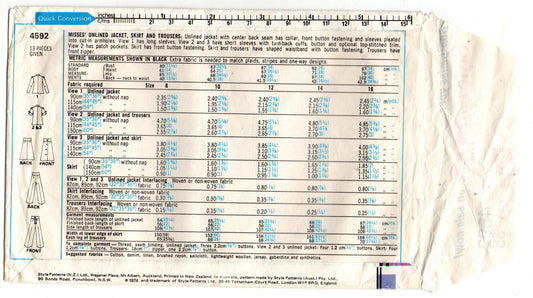 Patrón de costura vintage de los años 70, chaqueta de mujer con puños vueltos, falda y pantalones acampanados, estilo 4592, talla 12, busto 34 pulgadas