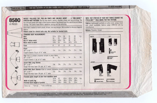 Patrón de costura vintage de los años 70 Simplicity 8580 para chaqueta y pantalones anchos informales de punto elástico para mujer, talla 10-14