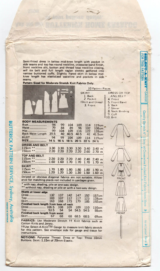 Patrón de costura vintage de los años 70 Butterick 5298 para vestido, blusa y falda de punto elástico de talla media para mujer, talla 16 1/2, busto de 39 pulgadas