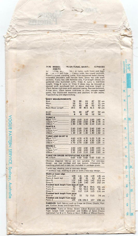 Patrón de costura vintage de los años 70 para mujer Vogue 7170, vestido, túnica y pantalones con hombros fruncidos, talla 8, sin cortar, doblado de fábrica