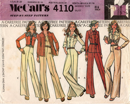 Patrón de costura vintage de los años 70 para chaqueta vaquera con cuello ancho y pespuntes estilo safari y pantalones acampanados para mujer de McCall's 4110, talla 8, busto 31,5 pulgadas
