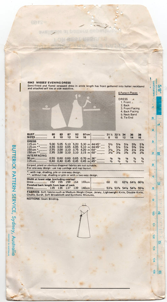 Patrón de costura vintage de los años 70 para vestido de noche con cuello halter Butterick 6943 para mujer, talla 14, busto de 36 pulgadas, sin cortar, doblado de fábrica
