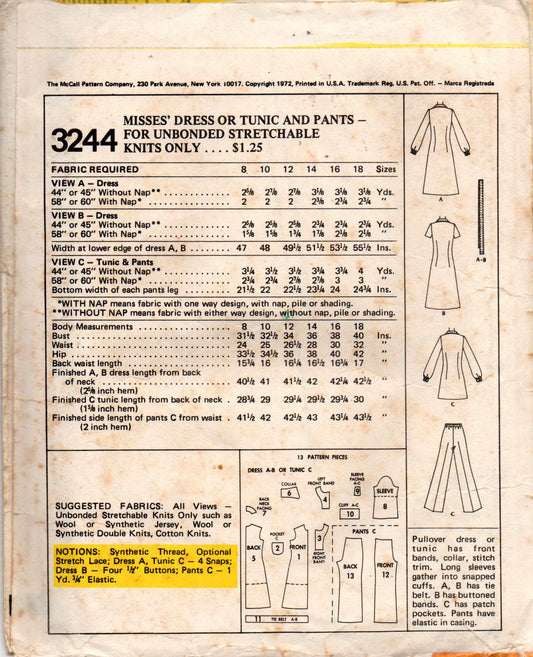 Patrón de costura vintage de los años 70 para vestido, túnica y pantalones de punto elástico para mujer McCall's 3244, talla 12, busto de 34 pulgadas, sin cortar, doblado de fábrica