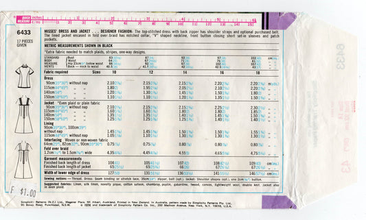 Patrón de costura vintage de los años 70 para vestido de verano y chaqueta de diseñador para mujer Simplicity 6433, talla 14, busto de 36 pulgadas, sin cortar, doblado de fábrica