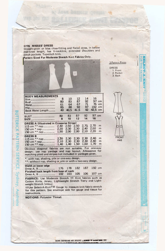 Patrón de costura para vestido de punto elástico fácil Butterick 4776 para mujer, estilo vintage de los años 70, talla 12, busto de 34 pulgadas