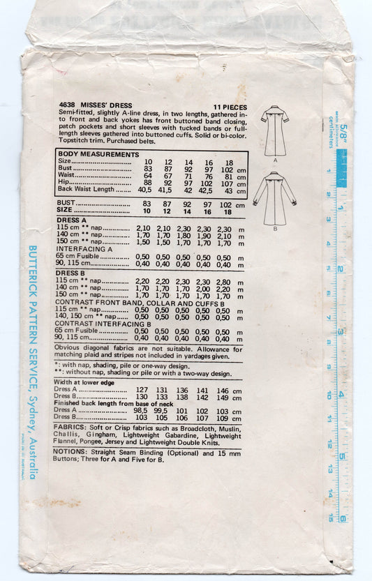 Patrón de costura vintage de los años 70 para vestido camisero de cuello ancho para mujer Butterick 4638, talla 12, busto de 34 pulgadas, sin cortar, doblado de fábrica