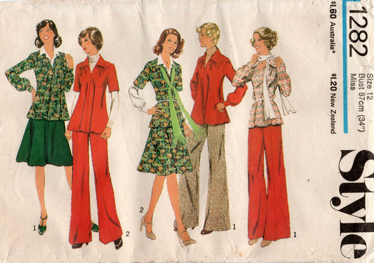 Patrón de costura vintage de los años 70, estilo 1282, para mujer, con cuello ancho, falda acampanada y pantalones de pierna ancha, talla 12, busto 34 pulgadas