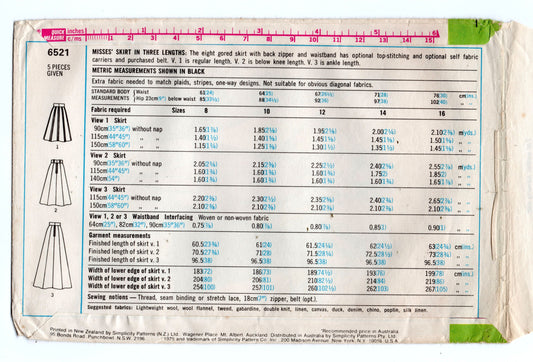 Patrón de costura vintage de los años 70 para falda o maxifalda con paneles para mujer Simplicity 6521, tallas 8, 10 o 14