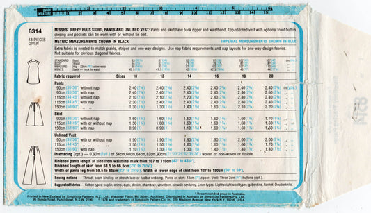 Patrón de costura vintage de los años 70 para falda, pantalón y chaleco JIFFY PLUS para mujer de Simplicity 8314, talla 16, busto de 38 pulgadas, sin cortar, doblado de fábrica