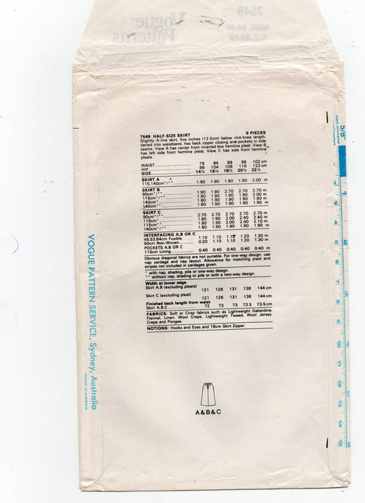 Patrón de costura vintage de los años 70, muy fácil de usar, Vogue 7549, faldas plisadas de media talla para mujer, cintura de 31 pulgadas, sin cortar, dobladas de fábrica