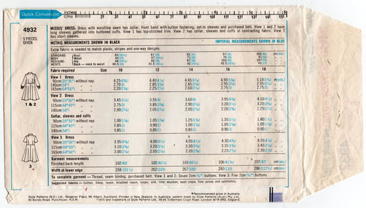Patrón de costura vintage de los años 70 para vestido camisero ajustado y acampanado estilo 4932 para mujer, talla 14, busto 36 pulgadas