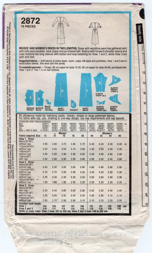 Patrón de costura vintage de los años 70, estilo 2872, vestido de noche para mujer con escote vuelto y mangas atadas, talla 16, busto 38 pulgadas