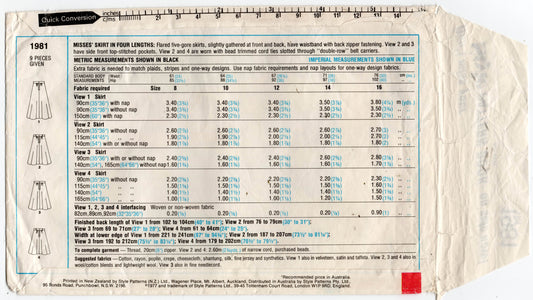 Faldas acampanadas para mujer, estilo 1981, con bolsillos profundos, en 4 largos, patrón de costura vintage de los años 70, talla 12, cintura 26,5 pulgadas