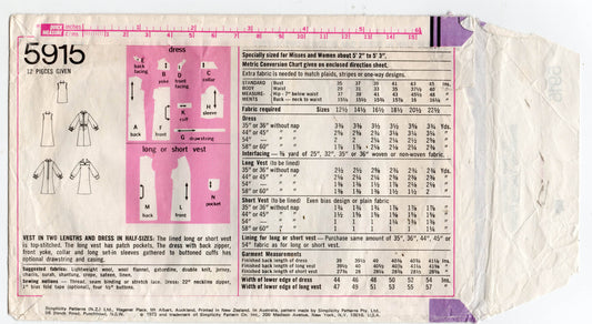 Patrón de costura vintage de los años 70 para vestido y chaleco largo con canesú de media talla para mujer Simplicity 5915, tallas 22 1/2, busto 45 pulgadas