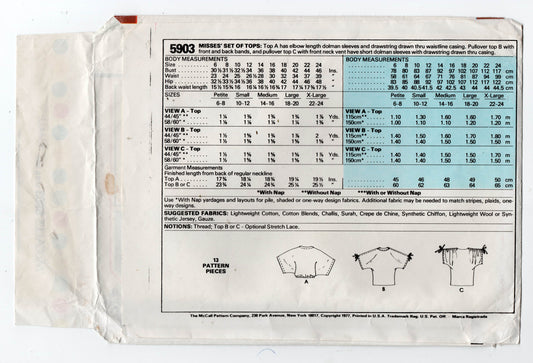 Patrón de costura McCall's 5903 para blusas casuales de verano para mujer, estilo vintage de los años 70, talla pequeña 10-12