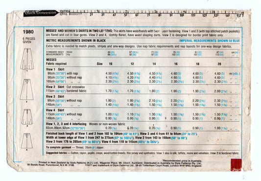 Patrón de costura vintage de los años 1970, estilo 1980, faldas para mujer, acampanadas, largas o con borde, cintura de 32 pulgadas, sin cortar, dobladas de fábrica