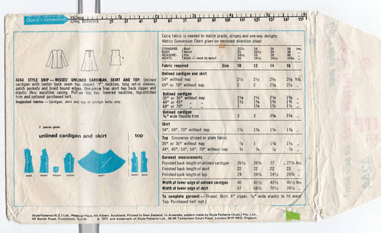 Patrón de costura vintage de los años 70, estilo 4244, para mujer, camiseta sin mangas elástica fácil de llevar, cárdigan con bordes en contraste y falda, talla 12, busto 34 pulgadas