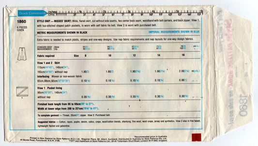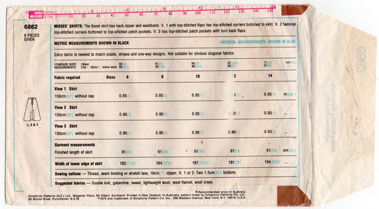 Patrón de costura vintage de los años 70 para faldas de una yarda para mujer Simplicity 6862, tallas 10 y 12