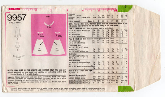 Patrón de costura vintage de los años 70 para faldas cortas y largas con corte al bies y cinturón para mujer Simplicity 9957, cintura de 24 o 30 pulgadas