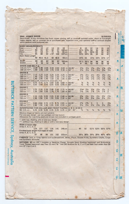 Patrón de costura vintage de los años 70 Butterick 6944 para vestido camisero con cremallera delantera y mangas raglán para mujer, talla 14, busto 36 pulgadas