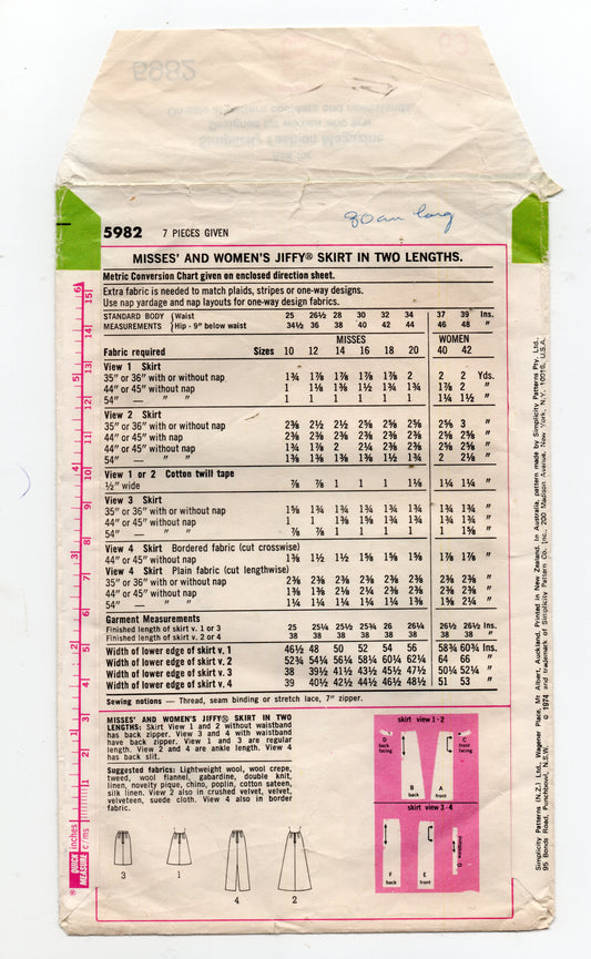 Patrón de costura vintage de los años 70 para falda/falda larga JIFFY para mujer Simplicity 5982, cintura de 28 o 32 pulgadas
