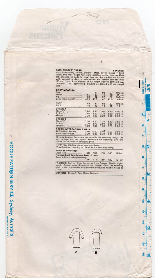 Patrón de costura muy fácil para vestido blusón con canesú para mujer Vogue 7313, años 70, talla 10, busto 32 1/2 pulgadas