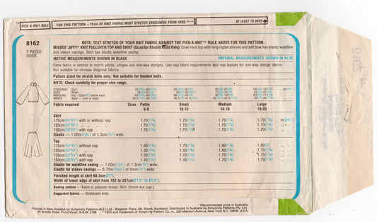 Patrón de costura vintage de los años 70 para blusa y falda con cuello vuelto elástico JIFFY para mujer Simplicity 8162, talla pequeña 10-12