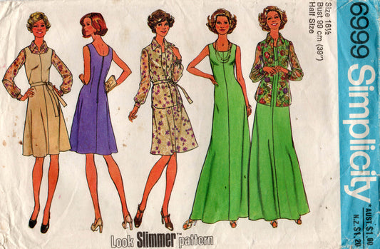 Patrón de costura vintage de los años 70 para mujer, vestido, jersey y blusa de talla media, Simplicity 6999, talla 16 1/2, busto de 39 pulgadas