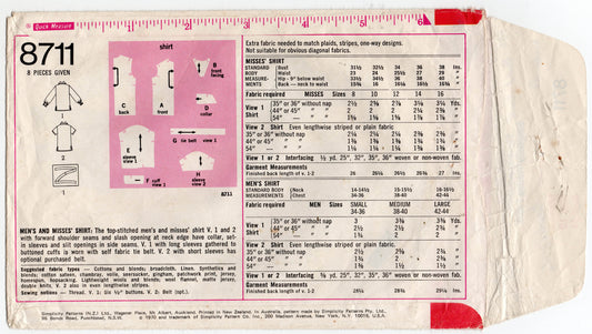 Patrón de costura vintage de los años 70 para camisas hippies estilo pulóver Simplicity 8711, talla 12, busto de 34 pulgadas