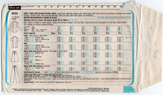 Patrón de costura vintage de los años 70 Simplicity 8035 para mujer, talla media, AJUSTE PERSONALIZADO, blazer, falda y pantalones con solapa ancha, busto de 37 y 39 pulgadas, SIN CORTAR, doblado de fábrica