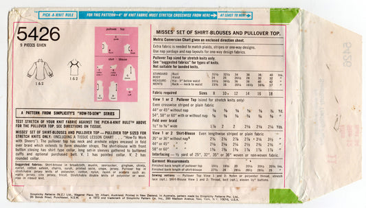 Patrón de costura vintage de los años 70 Simplicity 5426 para camisas de cuello ancho o de orejas de perro y camisolas elásticas para mujer, talla 12, busto de 34 pulgadas, sin cortar, doblado de fábrica