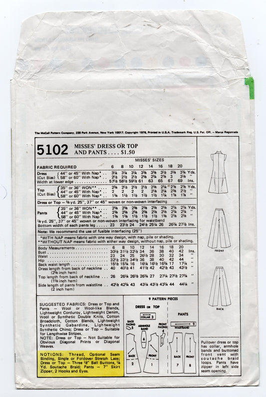 Patrón de costura vintage de los años 70 para vestido con mangas cortas y pantalones acampanados para mujer McCall's 5102, tallas pequeña 10 y 12