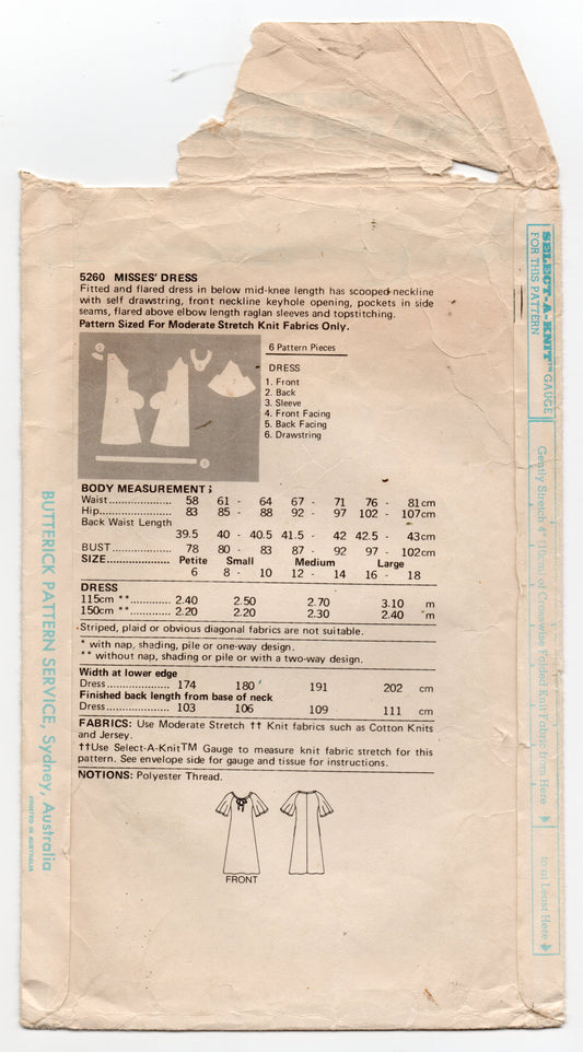 Patrón de costura vintage de los años 70 para vestido jersey de punto elástico fácil de usar con bolsillos para mujer Butterick Sew & Go 5260, talla GRANDE 16-18