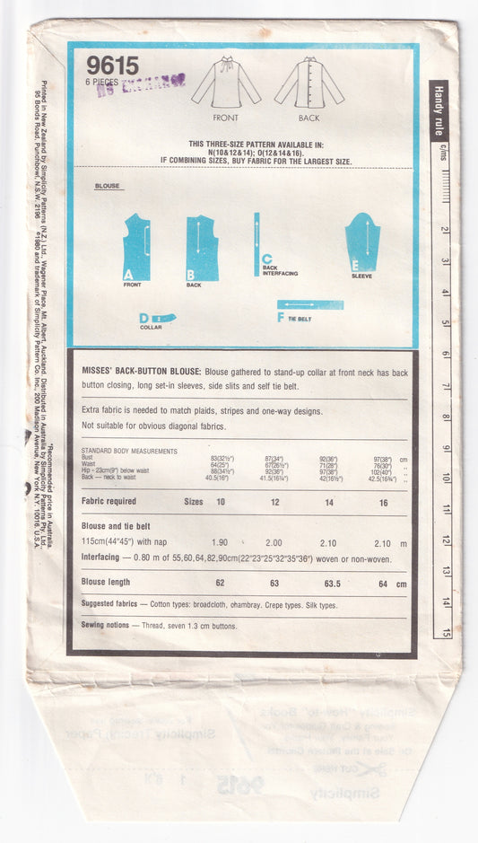 Simplicity 9615 Womens Back Buttoned Blouse with Mandarin Collar 1980s Vintage Paper Sewing Pattern Size 10 - 14 UNCUT Factory Folded