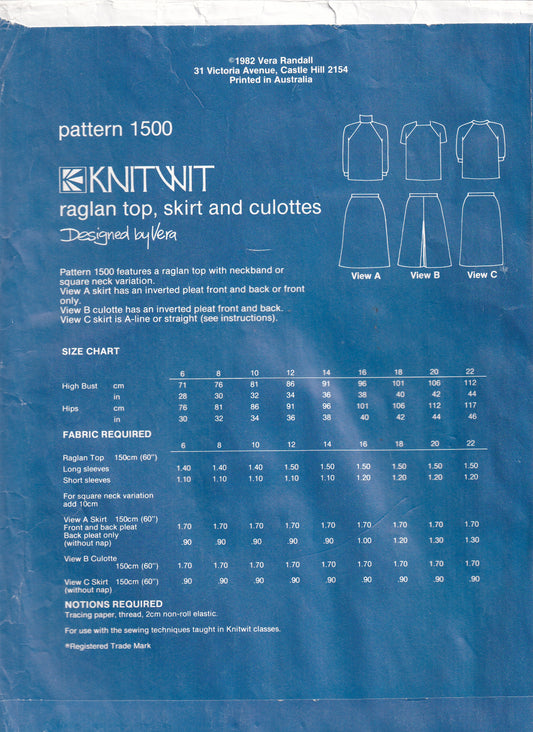 Knitwit 1500 Womens Stretch Knit Raglan Sleeve T Shirt Pleated Skirt & Culottes 1980s Vintage Paper Sewing Pattern Size 6 - 22 UNCUT Factory Folded