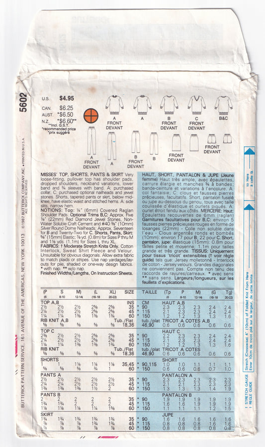 Butterick 5602 Womens Stretch Knit Top Pants Shorts & Skirt 1980s Vintage Paper Sewing Pattern Size L - XL UNCUT Factory Folded