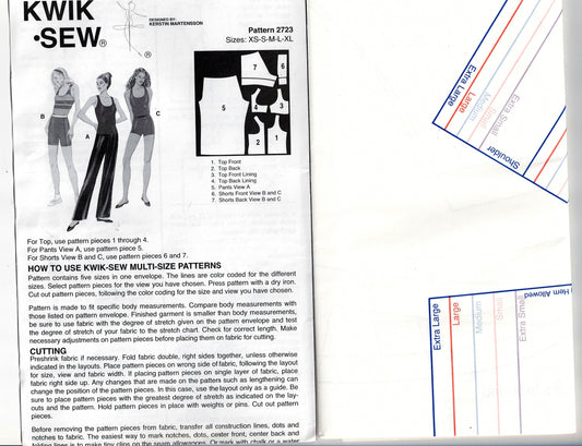 Patrón de costura Kwik Sew 2723 para pantalones cortos de baile elásticos para mujer, camisetas sin mangas, tallas XS a XL