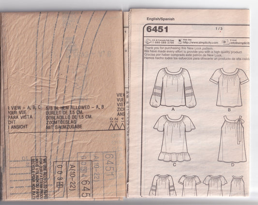 New Look 6451 Womens Raglan Sleeved Tops Out Of Print Sewing Pattern Size 10 - 22 UNCUT Factory Folded